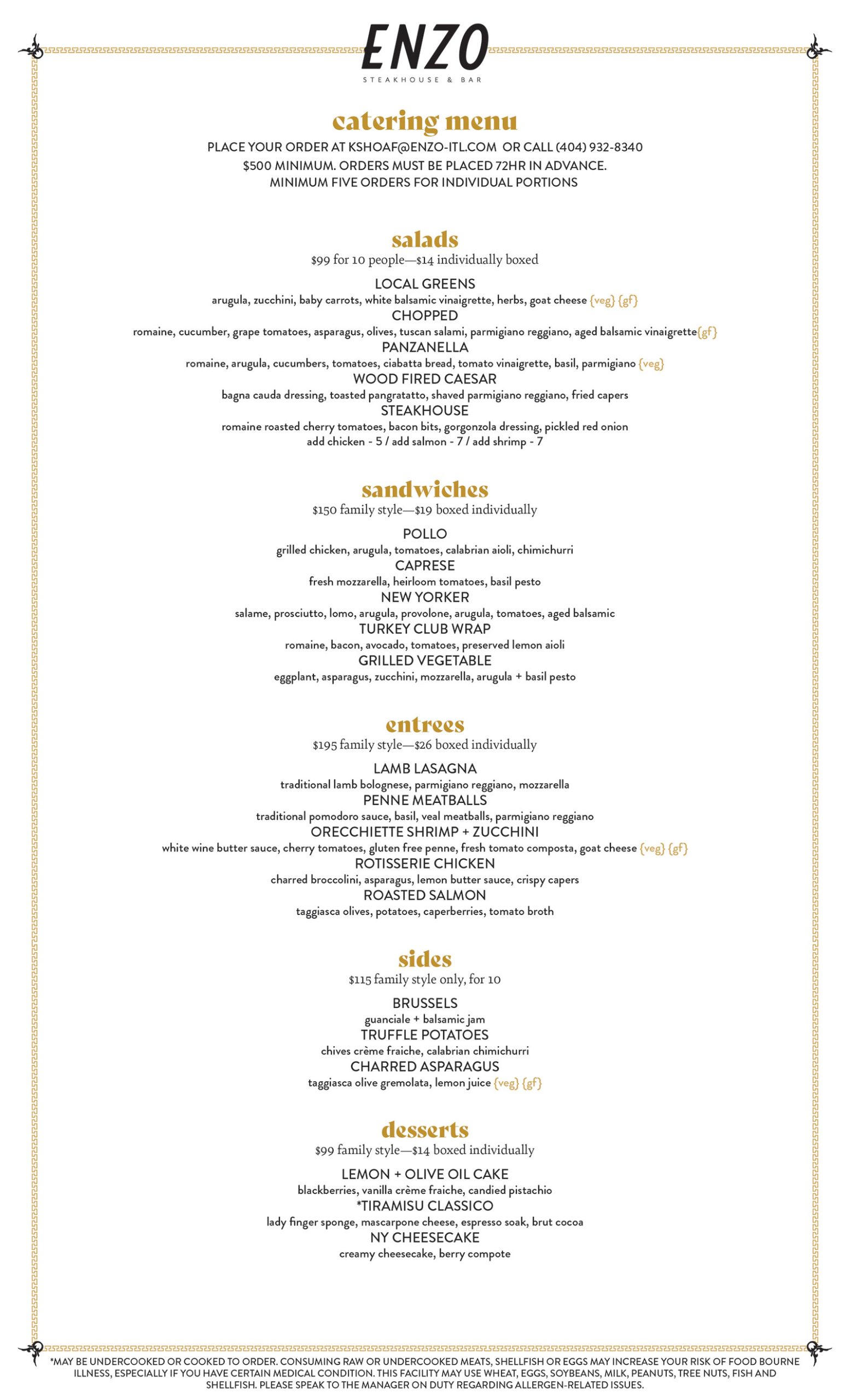 From passed hors d'oeuvres and multi-course plated dinners to curated buffet-style spreads, our catering menus are designed to bring the best of ENZO to every table. All our menus reflect seasonality, flexibility, and the unmistakable quality of Chef Andrea Montobbio’s kitchen.